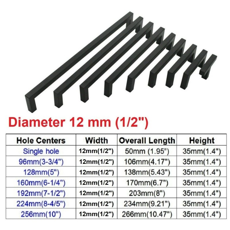 Gobrico 12mm 1/2" Black Kitchen Square Cabinet Handles Drawer Pull Knobs Stainless Steel - 96mm (3.75")