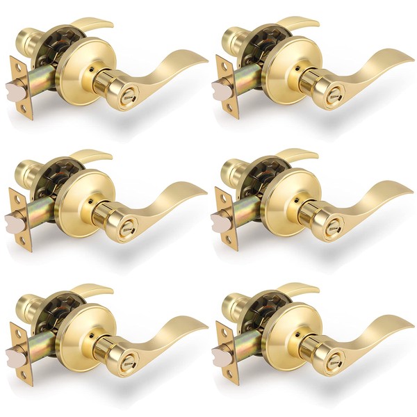 Gobrico Drop-Style Bedroom Bathroom Door Locksets Privacy Levers in Polished Brass,Interior Door Locks,6Pack