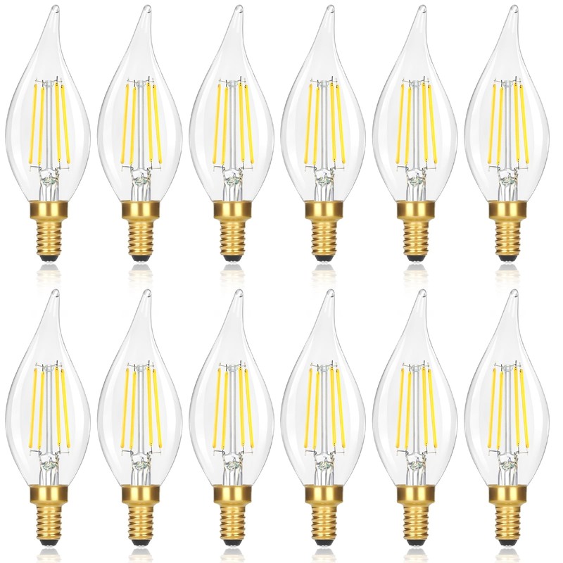 - Aesthetic Flame Tip Shape: These candle light bulbs combine a vivid flame tip design with a classic exposed filament to add elegance and charm to your lamp. E12 candle base candelabra bulbs are perfect for chandelier, Sputnik light, pendant, wall sconce lamp, Mason jar ceiling light, ceiling fan, lamp post, and other indoor or outdoor decorative lights