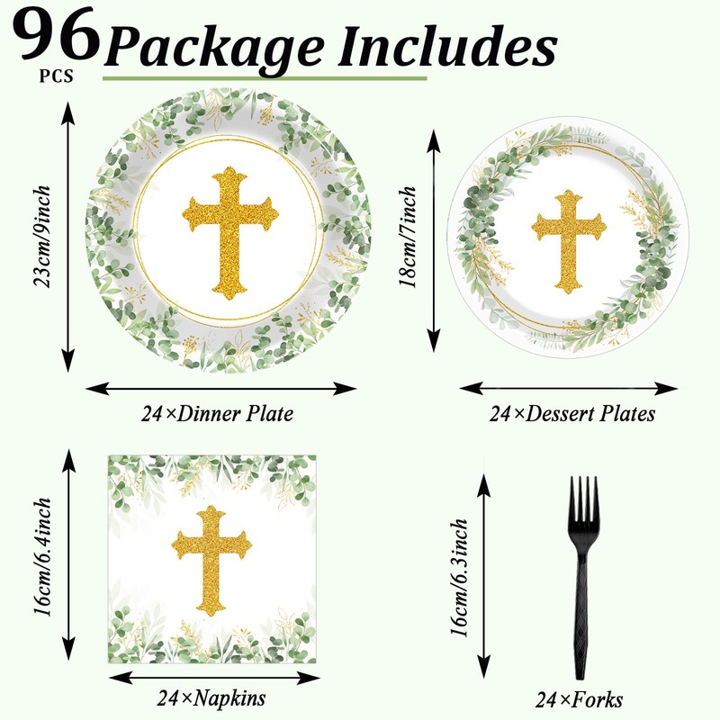 - Packing content: Our Baptism tableware set include 24pcs 9inch first holy communion dinner plates, 24pcs 7inch god bless dessert plates, 24pcs napkins and 24pcs forks that can serve 24 guests at mi bautizo christening birthday party. Impress your guests with this christening theme party supplies set.