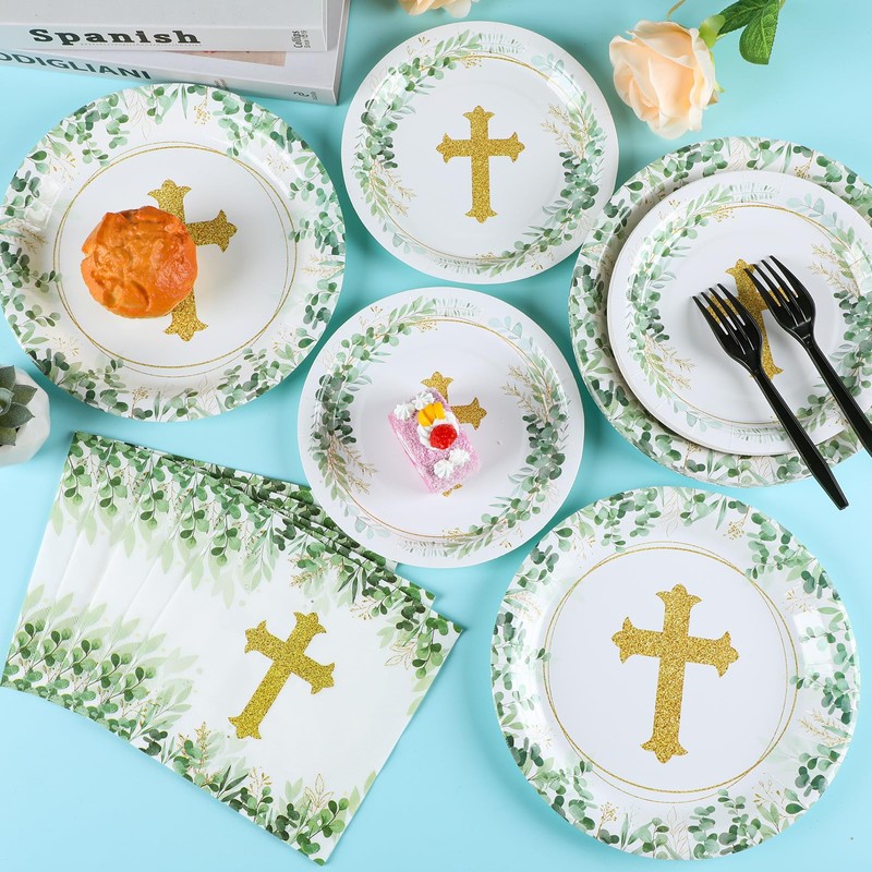 - Baptism party design: These god bless party supplies are based on the theme of first holy communion and feature a combination of gold crosses and green leaves. Decorating your first holy communion theme party with these mi bautizo tableware set can make your baptism party look vivid and all your guests will be happy.