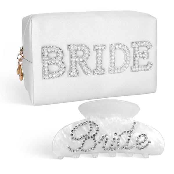 - 【Stylish & Spacious Bride Makeup Bag】Made of high-quality PU leather with a water-resistant finish for durability. Features pearl and rhinestone "BRIDE" letters for an elegant and luxurious look. Generously sized at 21 x 8 x 13 cm, offering ample space for cosmetics, makeup brushes, and travel essentials.