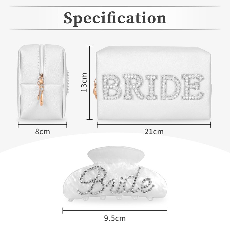 - 【Two Combination Options for Flexibility】Available in two package options: Option 1: Includes a Makeup Bag, Hair Clip, and Bride Slippers; Option 2: Includes a Makeup Bag and Hair Clip