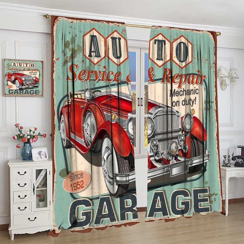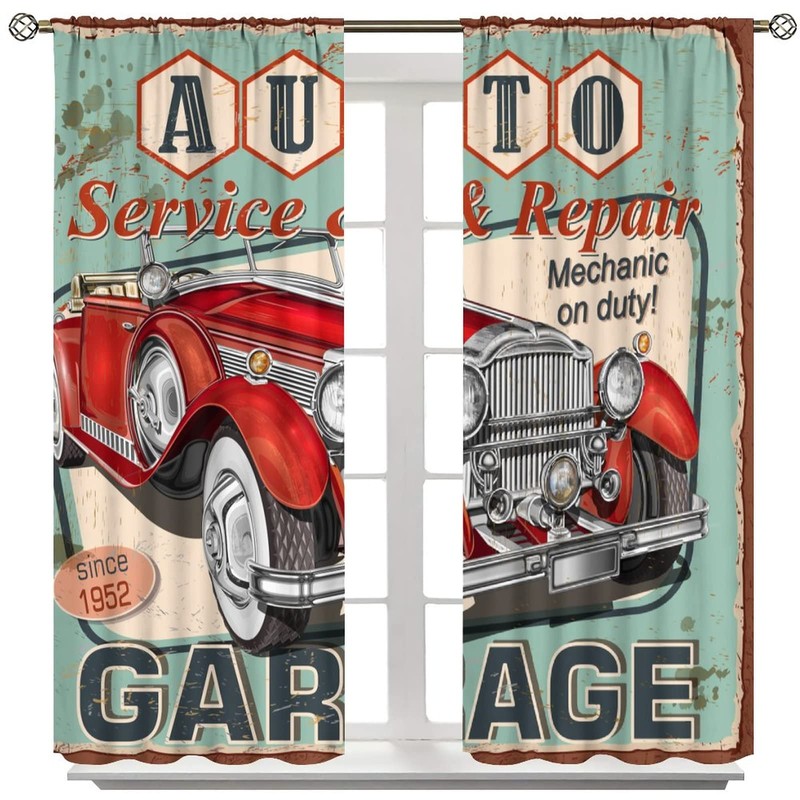 GoDazzling Old Truck Blackout Curtains Window, Classic Red 1952's Retro Shabby Green Background Garage Repair Classic Car Curtain, for Living Room Bedroom 42x45in 2 Panels
