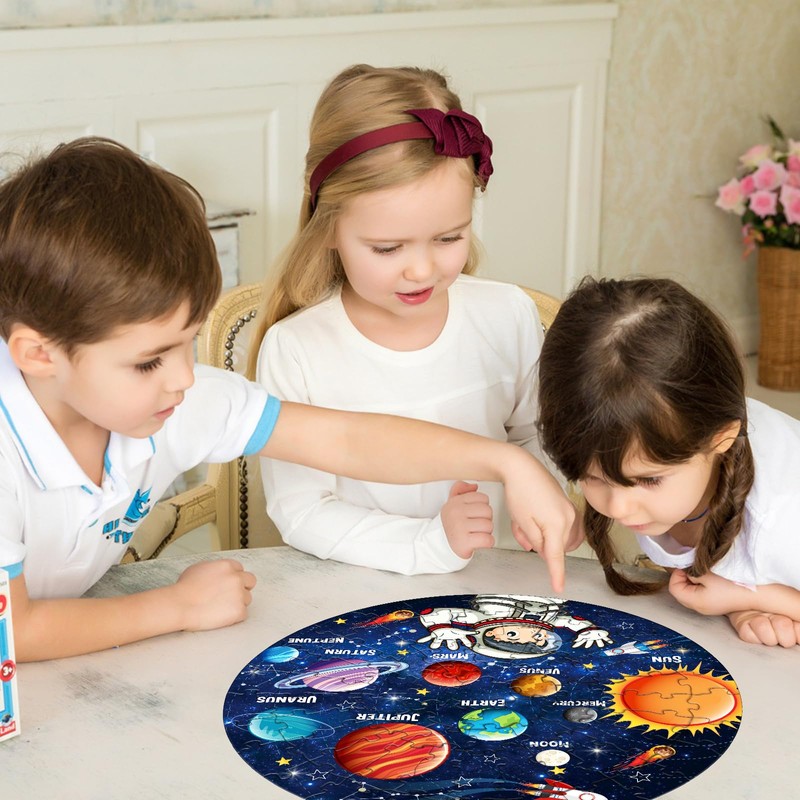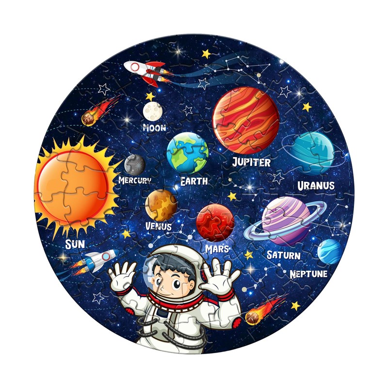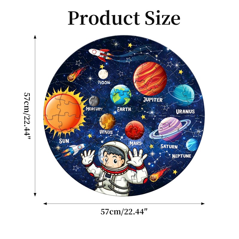 Our solar system children's floor puzzle is both educational and entertaining, taking children into the fascinating world of space. Each puzzle piece is designed with bright colors to attract children's interest while promoting their cognitive development.