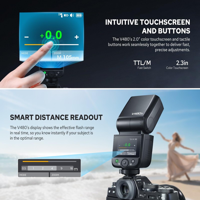 - Intuitive Touchscreen & Buttons: Godox V480 is equipped with a 2-inch full-colour touch screen and physical buttons work seamlessly together to deliver fast and accurate adjustment of parameters; The display also shows real-time effective flash range, so you’ll know instantly if your subject is within optimal reach, it's ideal for tight spaces, bounce applications, or fast-paced events