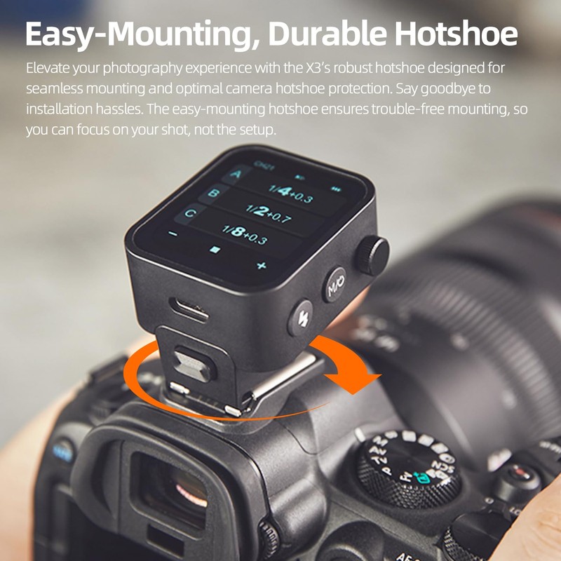 - Adopting quick release hot shoe design, combining swiftness and stability, effectively enhancing efficiency and safety, wireless synchronisation Convenient light control, equipped with Godox 2.4GHz wireless X system, you can quickly connect and control Godox flash devices. The channel scanning function effectively reduces interference and improves shooting stability, making it easy to cope with complex environments. The Wireless Sync function assists in the quick setting of wireless channels and identification numbers, allowing the X3 to seamlessly connect to upcoming vintage flashes with just one click.