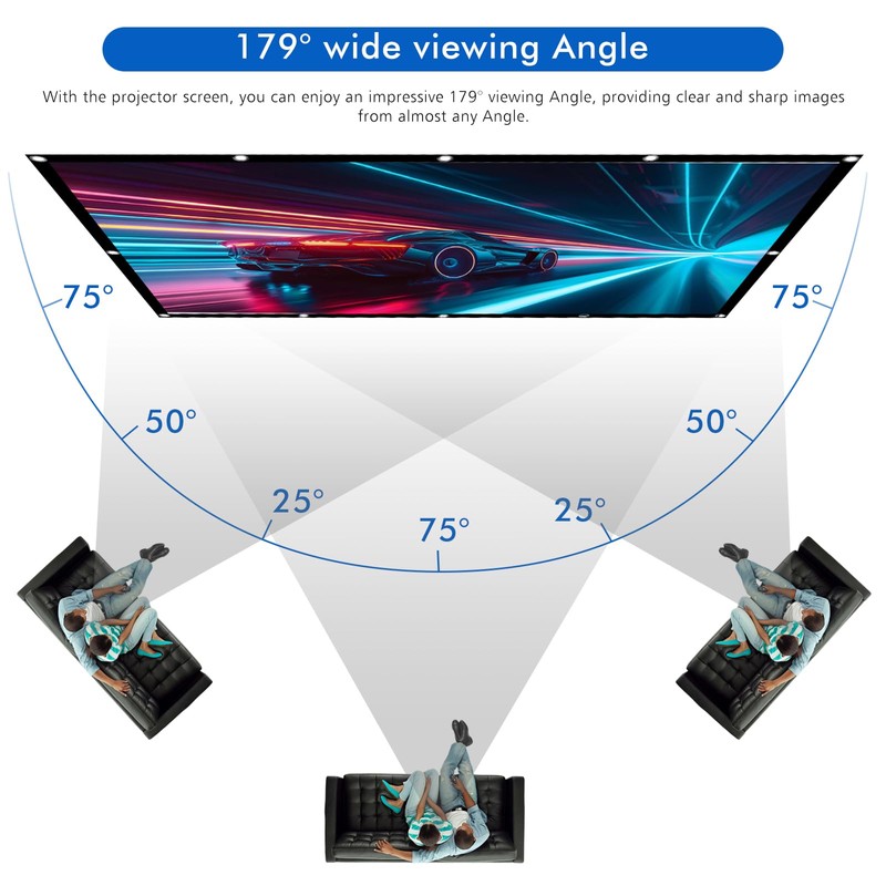 - 179° Wide Viewing Angle: With the projector screen, you can enjoy an impressive 179° viewing angle that delivers clear and sharp images from almost any angle. Perfect for larger groups, whether in the office, home or outdoors