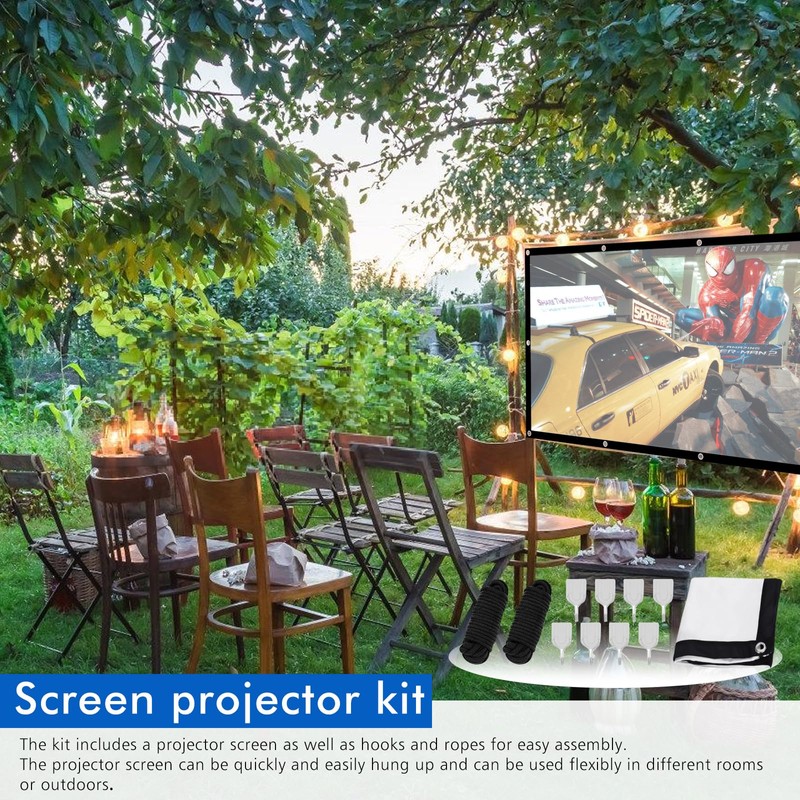 - Screen projector set: the set includes a projector screen as well as hooks and ropes for easy installation. The projector screen can be hung quickly and easily, which allows flexible use in different rooms or outdoors