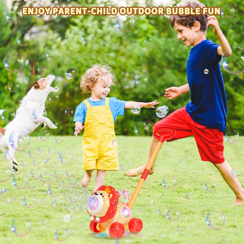 - AUTOMATIC BUBBLE MACHINE - This lion bubble blower offers two fun modes: push the handle for automatic bubble blowing while on the move, or use it as a handheld bubble machine for more flexibility. It’s an excellent outdoor toy for toddlers and can even entertain pets. Whether in your backyard, park, grassy area, or beach, this bubble blower is a fantastic addition to any outdoor adventure.