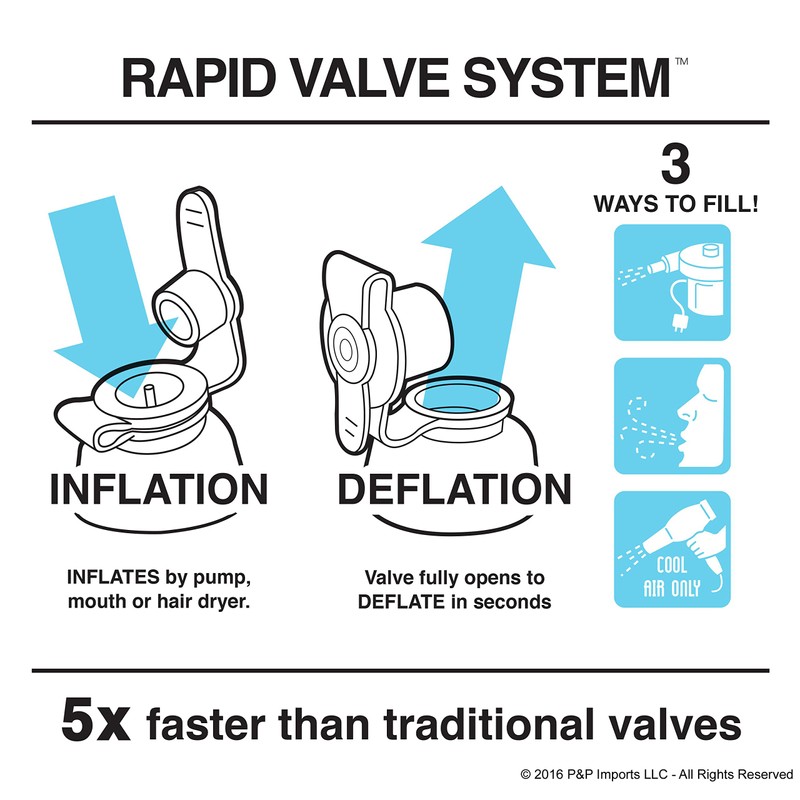 - RAPID VALVE INFLATION: Allows for 10x faster inflation and deflation compared with traditional valves (2 minutes vs 20 minutes)