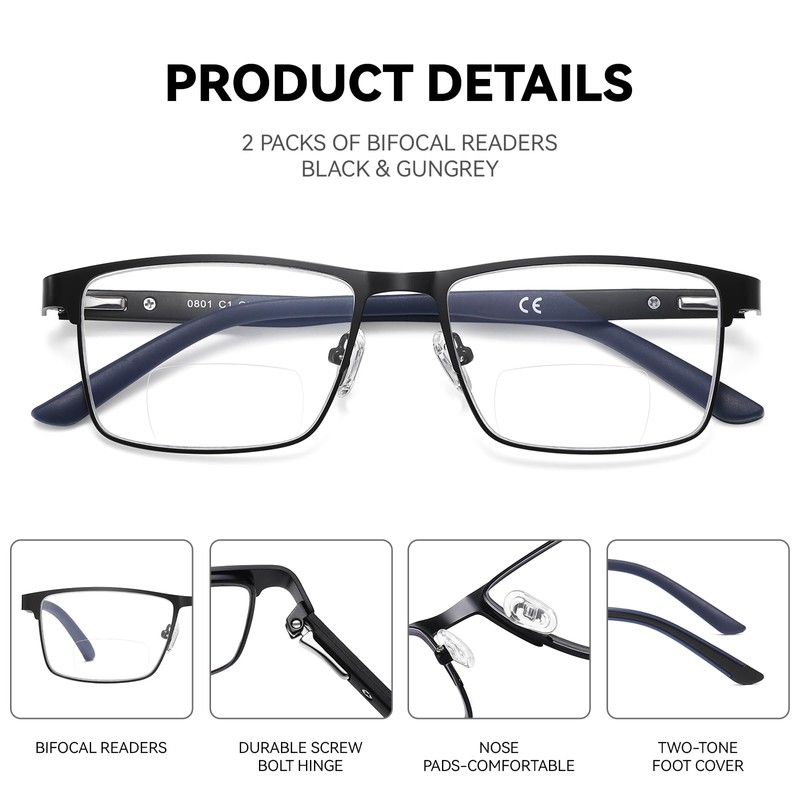 - 【2 PACKS METAL BIFOCAL READERS】 A set of 2 pairs, metal decoration fashion bifocal reading glasses, suitable for all Men face shape. you can keep one at home and one in the office,you can have it at your fingertips, whenever you need it. Plus 1 matched leather eyeglass pouches, 1 microfiber glasses cleaning cloth, and 1 glasses rope hanging.