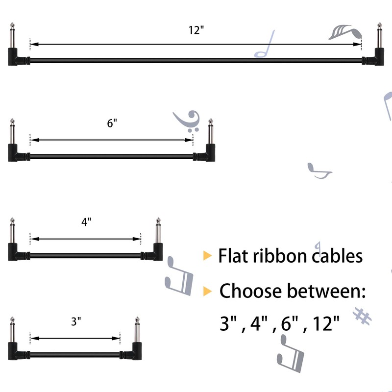 • Our guitar pedal patch cables can also be used for audio signal transmission of microphones, amplifiers, mixing consoles, and other equipment. You can choose between 3", 4", 6", and 12" patch cables for an easy fit.