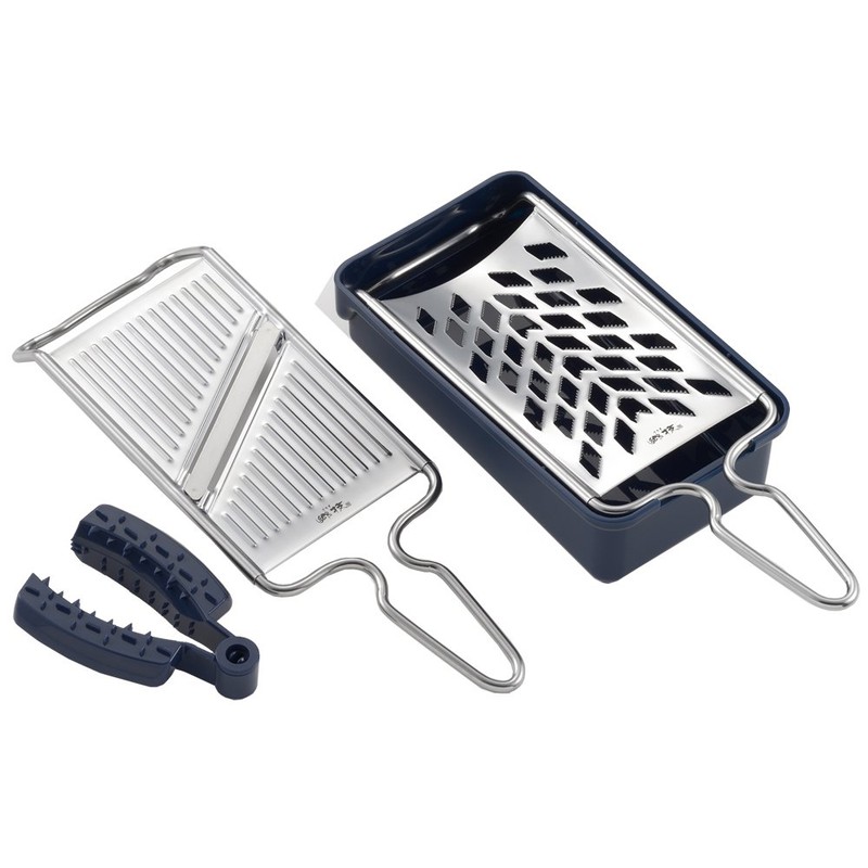 - Materials: Container: Polypropylene, Safety Holder: ABS (Acrylonitrile Butadiene Styrene) Resin, Slicer: 18-0 Stainless Steel, Slicer Blade: Stainless Steel Knife, Grater: 18-0 Stainless Steel, Non-Slip: Natural Rubber