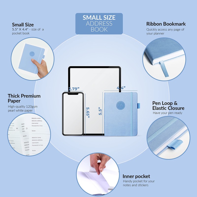 - SMALL FORMAT & PREMIUM QUALITY – This mini address book for woman comes in a small size (4x5.5”) and features a durable eco-leather hardcover, thick 120gsm paper, lay-flat binding, elastic band, pen loop, bookmark, and pocket for notes and contact cards.