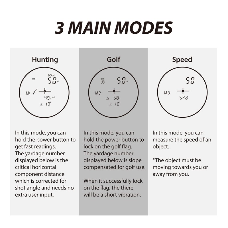- HORIZONTAL DISTANCE: Mode 1 is specially designed for hunting and will display straight-line distance, horizontal distance, and angle. Mode 2 is specially designed for Golfing and provides slope compensation and flag lock function. The rangefinder also has a scanning function, which is convenient for you to quickly catch prey.