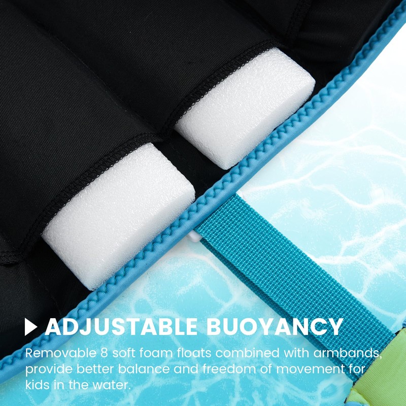 8 removable foam floats are designed to provide children with the required adjustable buoyancy, maximum 50N buoyancy.