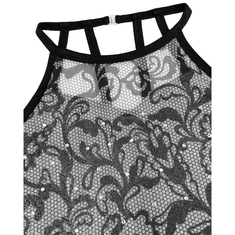 - ELEGANT RHINESTONE & MESH FLORAL DESIGN -- The combination of glittering rhinestones and intricate mesh floral design gives this outfit an elegant look that exudes professionalism. Give your young gymnast a fashionable edge with our Girls' Three-Piece Halter Gymnastics Set.