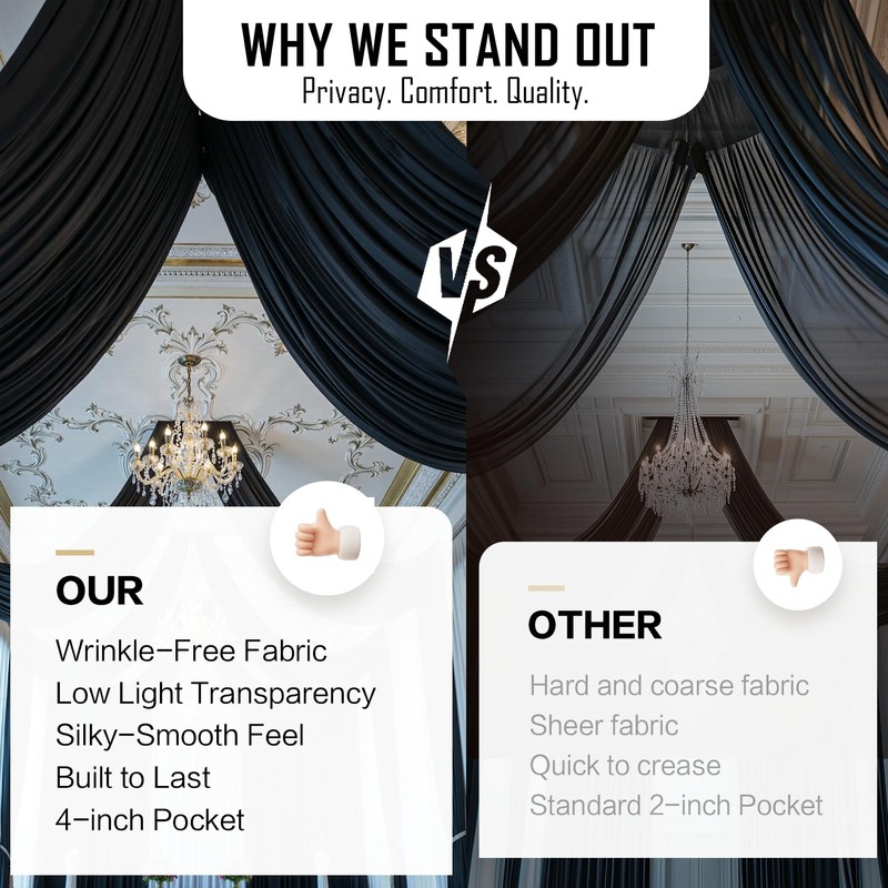 - Luxury Soft Polyester Fabric | Ultra-Low Sheer : Made from premium wrinkle-resistant polyester, these drapes feature ultra-low light transmission for a soft, elegant look. Lightweight yet durable, they resist tearing and maintain a flawless, flowy appearance throughout your event