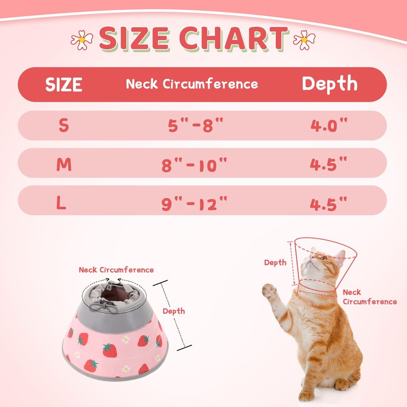 - Multiple Choice: This cat recovery collar & cone are fashionable and cute, with three fruit patterns to choose from: strawberries, watermelons, and lemon. Available in sizes S and M, suitable for most cats. Please refer to the size chart before purchasing and measure the circumference of the pet's neck and the distance from the neck to the nose to ensure that the length of the cat's head is less than the depth of the cat cone, then choose the appropriate size.