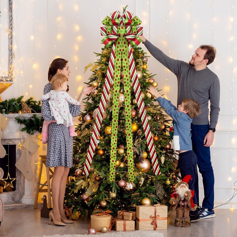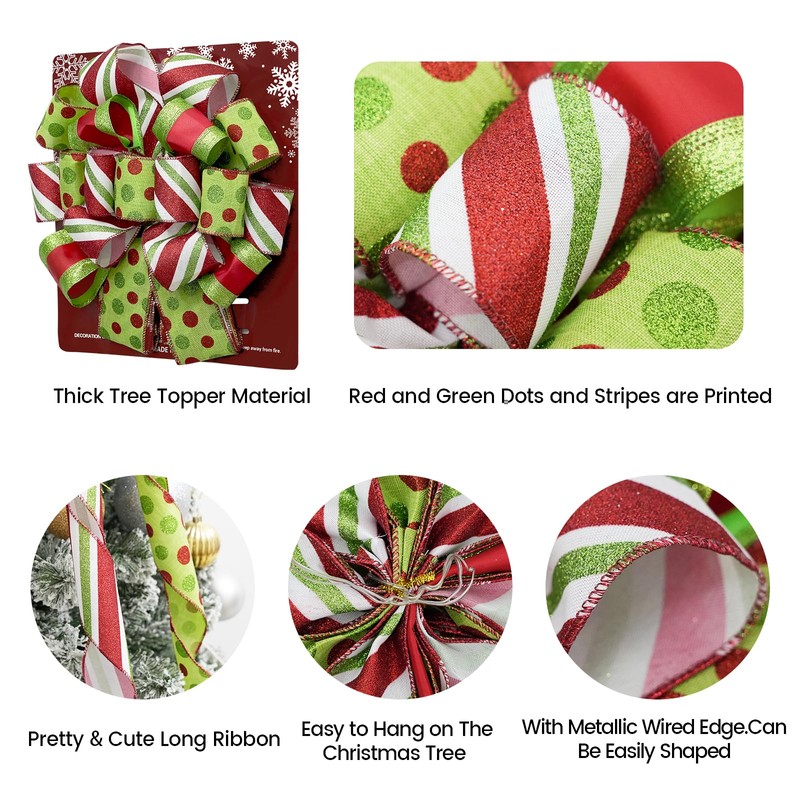 - ❄️Xmas Decorations for Home: Xmas Bow ribbon surface printed with glitter red and green dots which are very shiny.Perfect for spreading holiday spirit and bring good luck to whole family.Those Xmas tree topper make your Christmas tree more beautiful/warm/vivid and makes your home look more Christmas atmosphere,allowing you and your family to spend an unforgettable Christmas.Our large christmas tree bows is the best bow for Christmas tree and will surely bring you and your family a surprise.