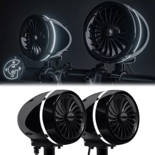 - Revolutionize your ride with the GoHawk AJ4-Halo, the ultimate 2-channel 4” full-range motorcycle stereo speakers that combine powerful sound, stunning visuals, and unmatched convenience. Featuring the iconic LED Halo Speaker System, these speakers deliver 300W of high-performance bass with a built-in Class-D amplifier—no additional equipment needed.