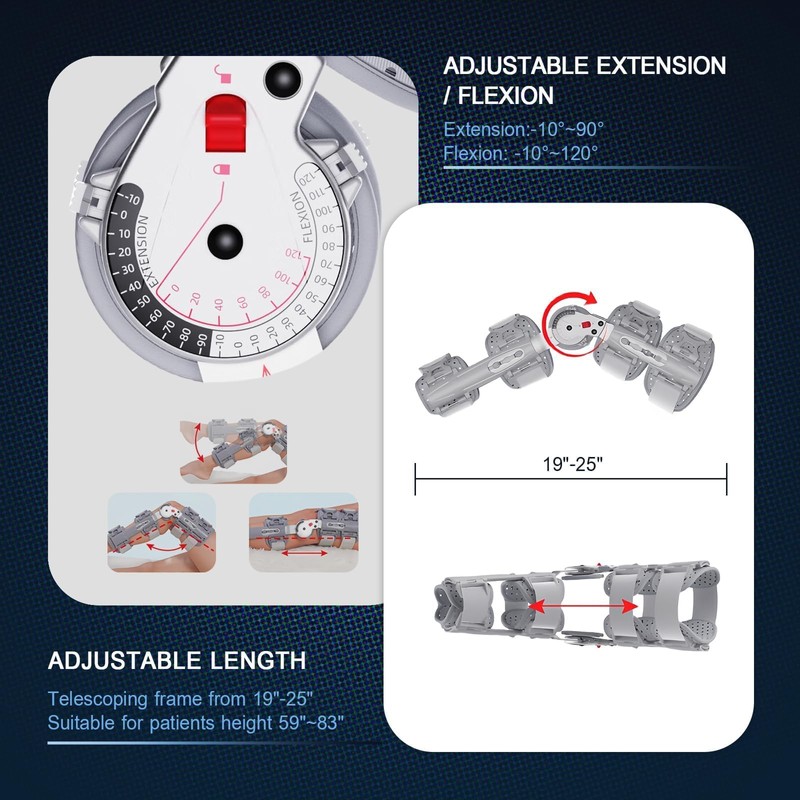- 【Complete Control with Adjustable Range of Motion Dial and Flexion/Extension Sliders】The unloading knee brace features 25 adjustable dial extensions and flexion/extension sliders, limiting and preventing excessive knee extension and flexion. This ROM knee brace ensures optimal recovery post bone-on-bone protection and most knee pain injury rehabilitation.