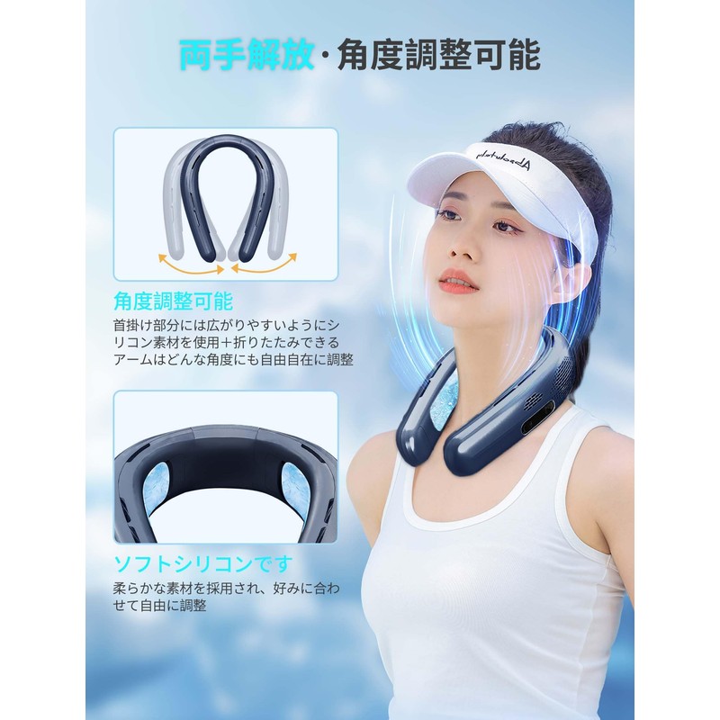 - (Free Your Hands and Fine Angle Adjustment) The part of the neck fan is made of silicone material so it is easy to put on and take off, so it can be worn regardless of body type. Just hang it around your neck for instant cooling and free your hands. The unique cooling plate design and ergonomic curved design ensures that each point is evenly weighted and won't strain your neck or shoulders. You can stay comfortable without neck and shoulder fatigue, even during active outdoor activities or working for a long time