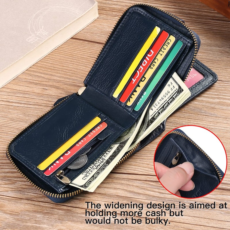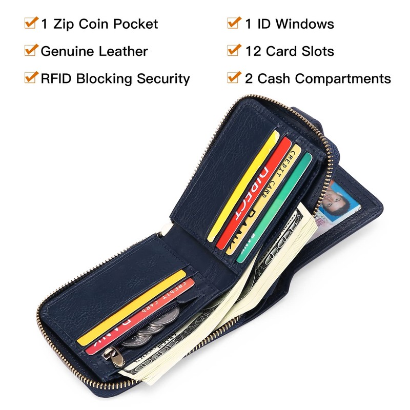 • Mens Wallets Leather Large Capacity: 12 card slots + 2 cash compartments + 1 driver's license / ID/ photo window + 1 zip coin pocket. This wallet for mens is easy to carry important cards for your daily needs