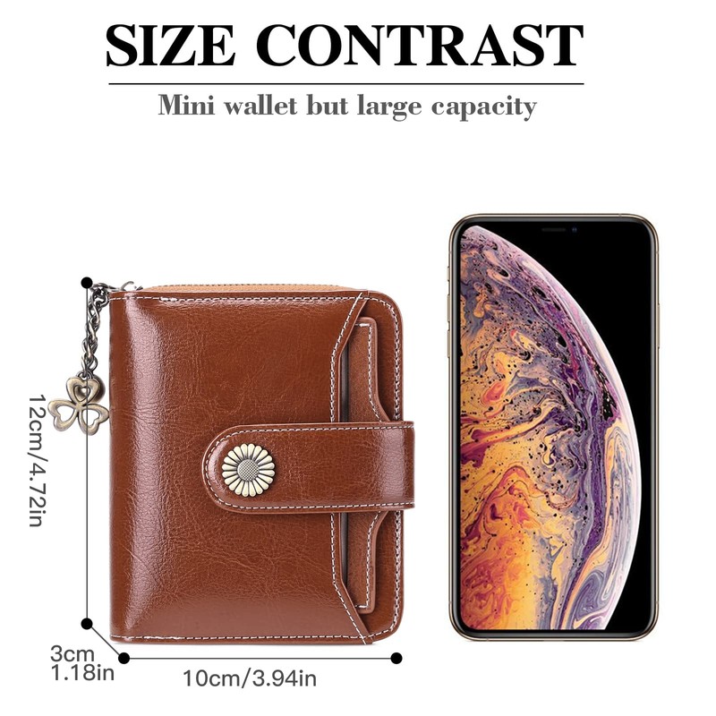 - 【Small Women Wallet】4.72 x 3.94 x 1.18" (12 x 10 x 3cm)-8 Credit card slots, 2 visible ID window, 1 cash compartment, 1 zipper coin pocket and 1 removable card sleeve (contain 1 card slots & 1 ID window). Compact size with enough capacity to hold all kinds of cards and changes you need daily