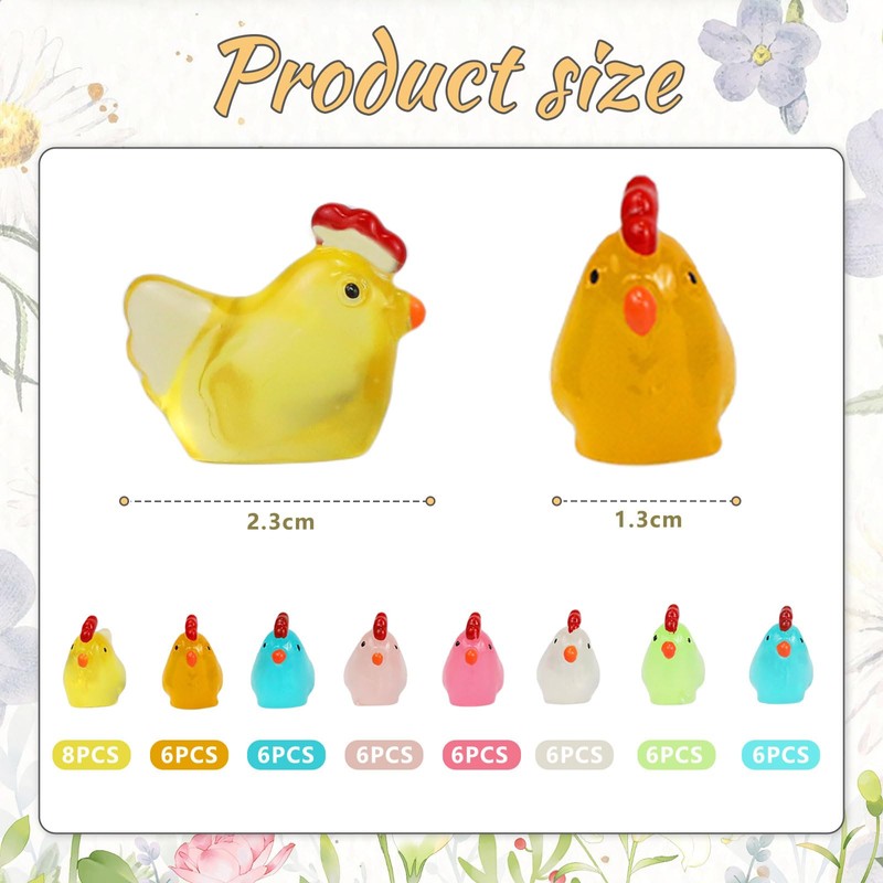 - Mini resin set: you will receive 50 mini chicken animal signatures, available in white, yellow, orange, pink, light pink, purple, blue, and green. The size of the mini chicken is 0.9 x 0.5 inches, perfect for various decorations.