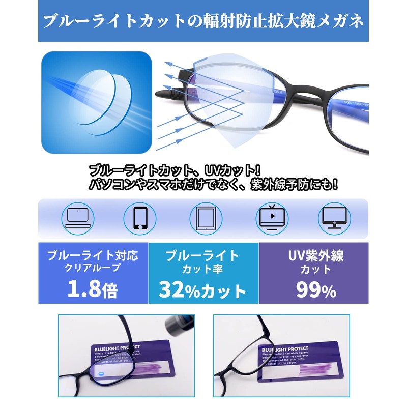 • ✅【超軽量!弾力性に優れたTR90フレーム】★フレームの重さはわずか5.0g、折れないTR90仕様の超軽量弾性樹脂フレームとテンプルの採用により、とても軽量で、弾力性を持ち衝撃に強く、変形しにくく、折れにくい、金属アレルギー対策などの特徴があります。少々曲げても折れることなく、快適にお使いいただけます。 ★テンプルにクリップ付きなので胸ポケットにつけます。落下の心配はありません。 ★テンプルにメガネのずり落ちを防いでくれるシリコン製ストッパー付き。しっかりソフトにメガネを固定! 大き過ぎず小さ過ぎずシンプルで掛けやすいなので男性、女性問わず、どなたにもお似合いになりご愛用頂けます。フィット感が良く型崩れしにくい超軽量ルーペメガネです。※本商品はメガネの上からかけることはできません。予め了承のうえ、ご注文おお願いいたします。