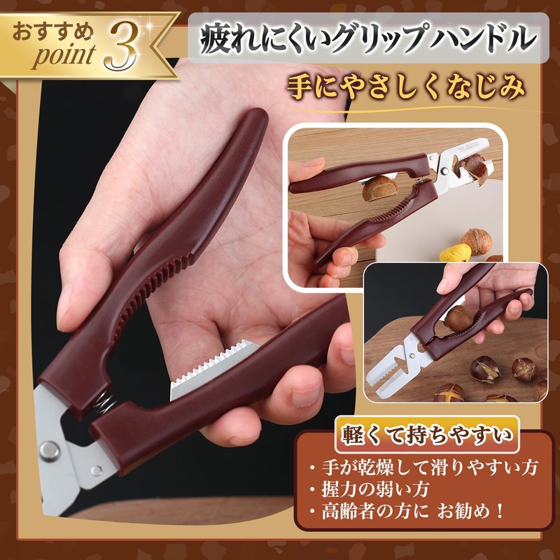 This chestnut peeler peels beautifully with chestnut demon skin and peeler. Recommended for those who have dry hands and slippery, weak grip strength and seniors. It can be used like a knife and can be used with both raw and boiled chestnuts. In addition to peeling chestnuts, it is also recommended for peeling maroto potatoes.