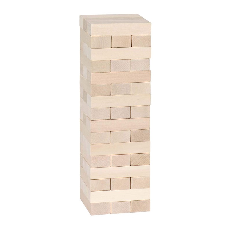 - The players take it in turns to remove a wooden stone from the wobble tower and place it on the top.