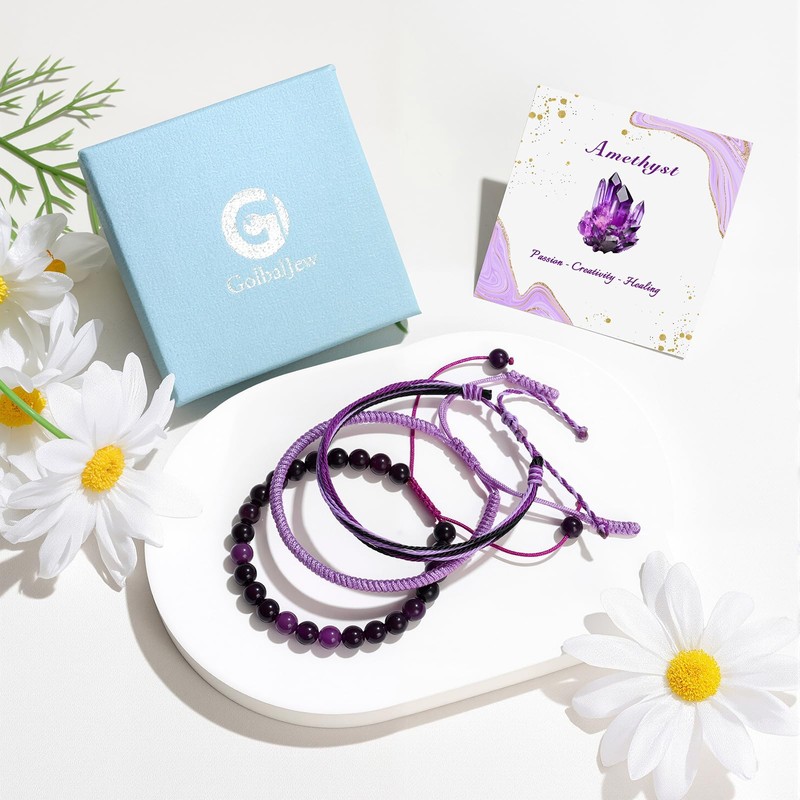 GolbalJew Healing Crystal Beaded Bracelets for Women Men, 6mm Amethyst Stone Beads Bracelets Set with 2PCS Adjustable Purple Rope Bracelets