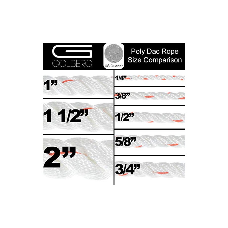 Offering a great grip and soft to the touch, Golberg 3 Strand PolyDac Rope is white with colored tracers and is available in a variety of sizes and lengths to fit your needs. This Polyester/ Dacron rope is 100% back by the Golberg guarantee.