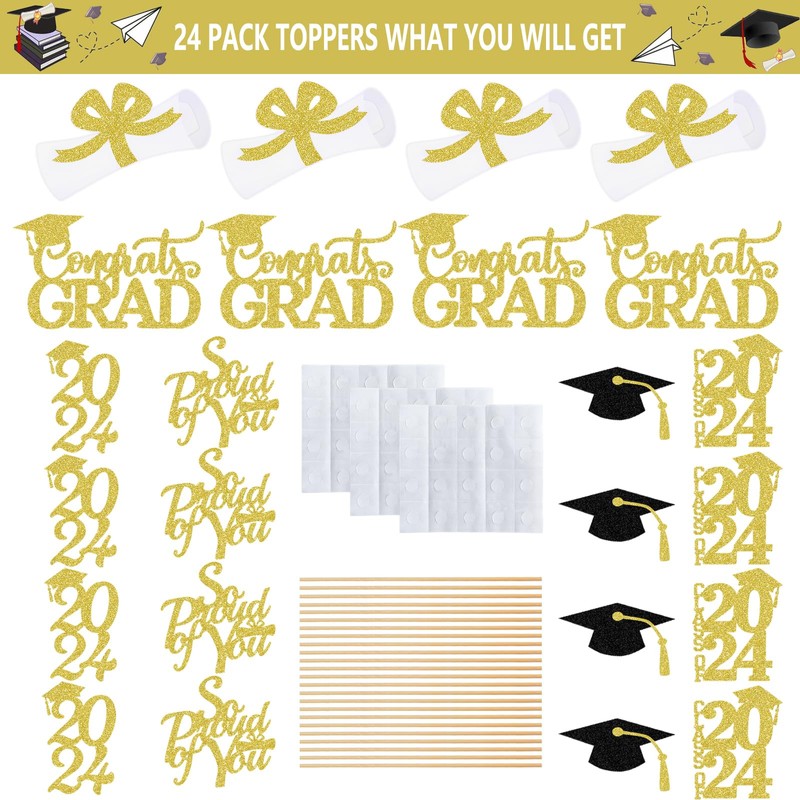 - 🎓🎓【What you will get】24Pcs gold glitter graduation party table centerpieces with 6 different style design and each style has 4 pieces.These gorgeous 2024 gradation table toppers decorations will definitely make your graduation party fabulously attractive.