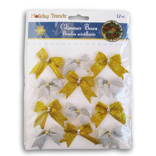 Gold and Silver Glitter Miniature Decorative Tie-On Christmas Bows - 12 Count