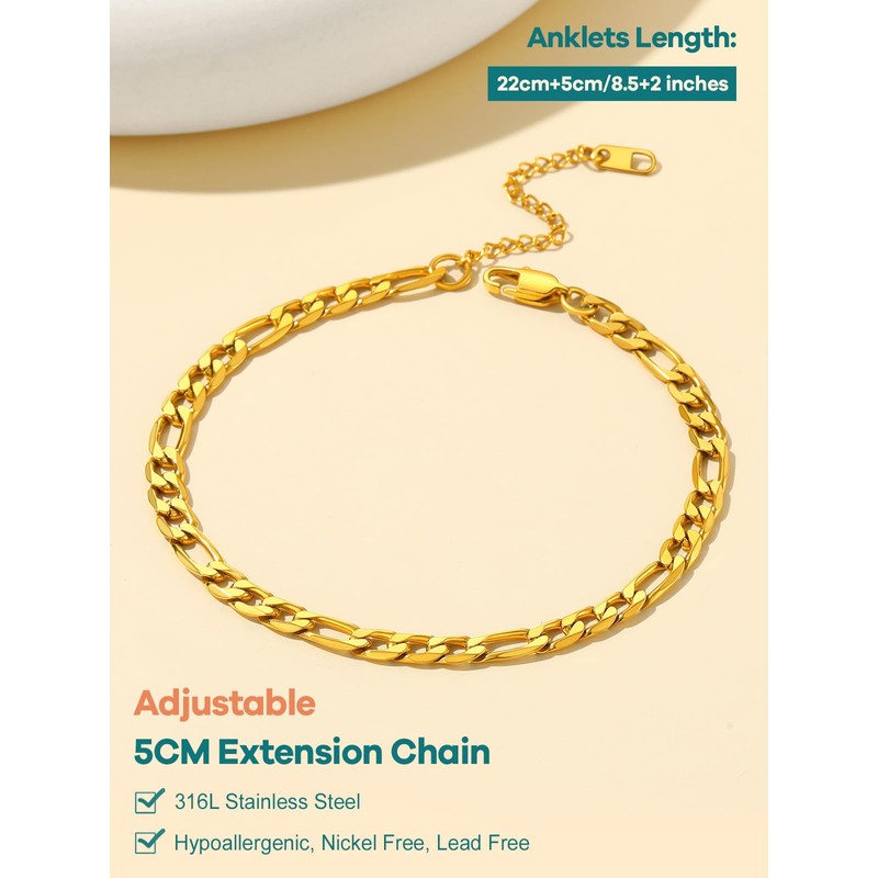Gold Anklet Chain for Mom, Stainless Steel Figaro Chain Ankle Bracelets Simple Jewelry, Summer Gifts for Girlfriends Daughters