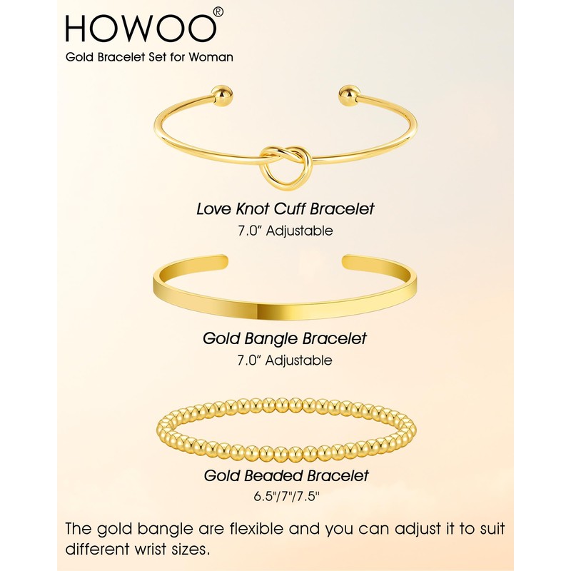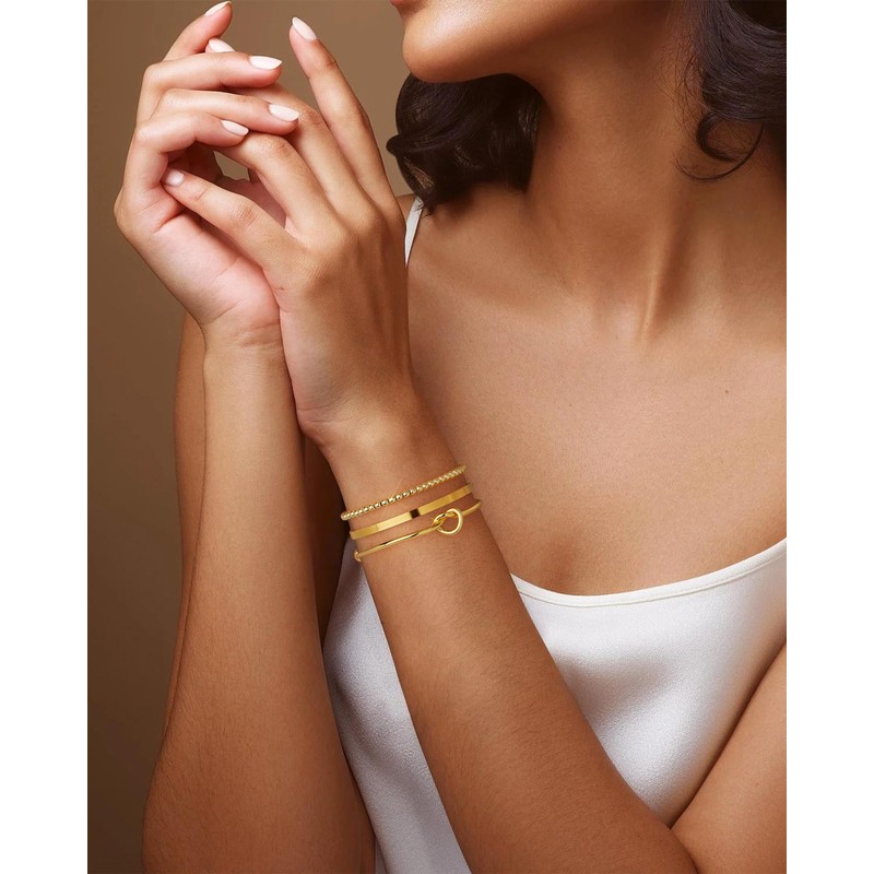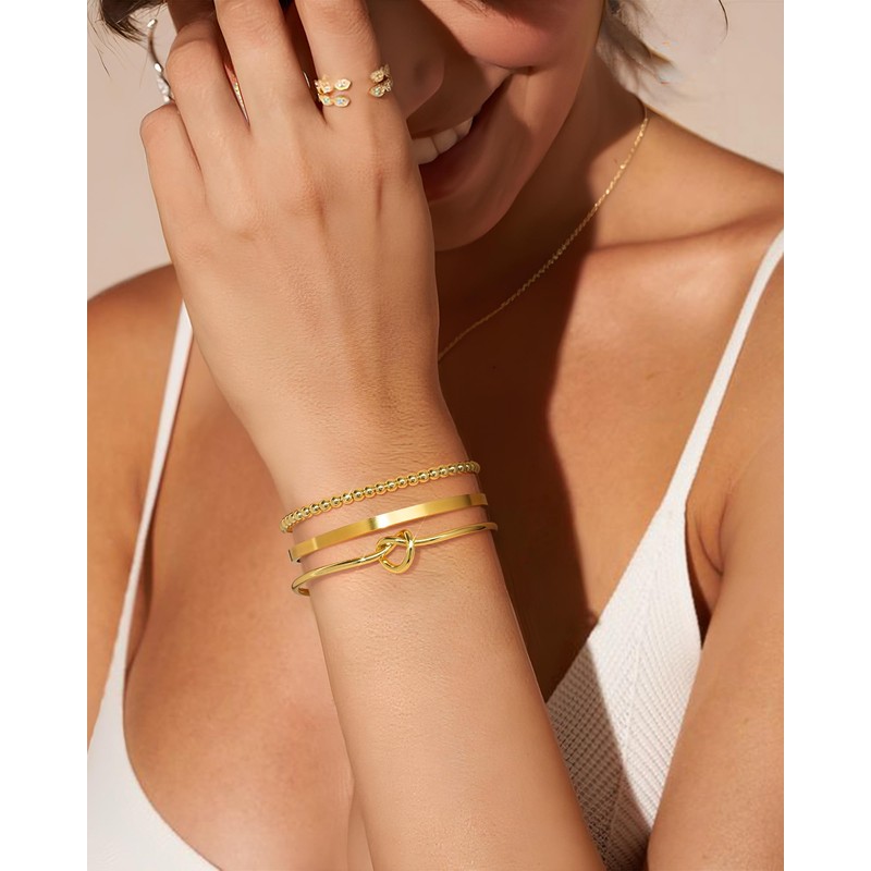 - Gold Bracelets for Women 3pcs: Elevate your stack with the gold bracelets set. Designed for minimalist layering, this set features bangle bracelet/ figaro link/ cuban chain/ knot cuff/ beaded bracelet. We love wearing this bracelet both on its own or layered with other bracelets for a fully stacked look.