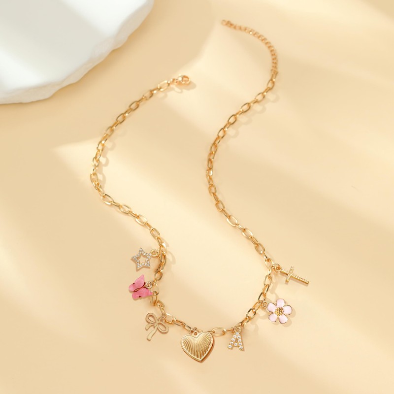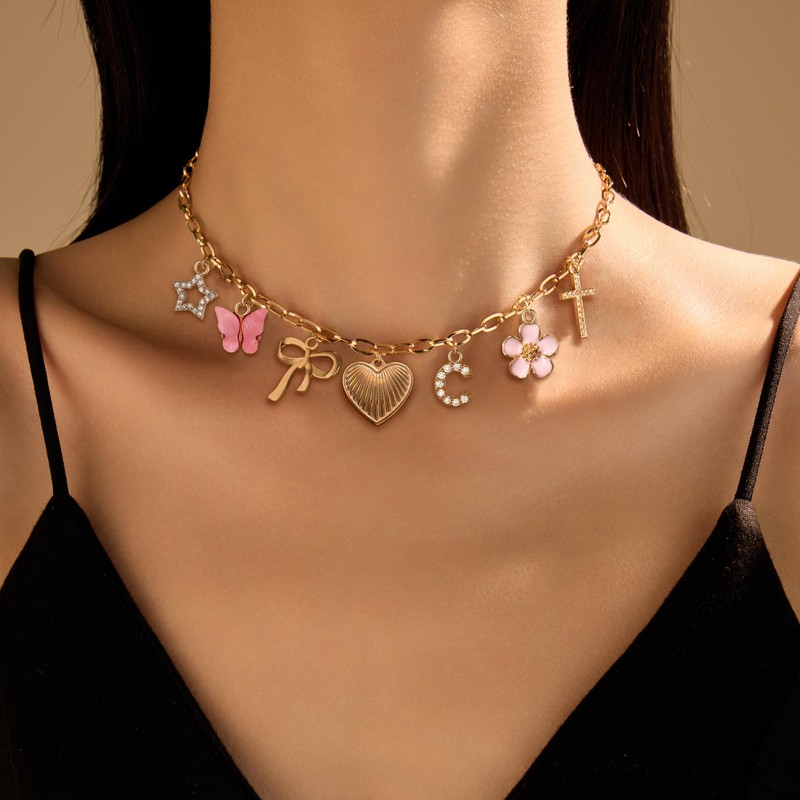- Personalized Initial Necklace: Showcase your style with this gold letter charm necklace, featuring dainty bow, cross, heart, butterfly, star, and flower charms for a unique and personalized touch.