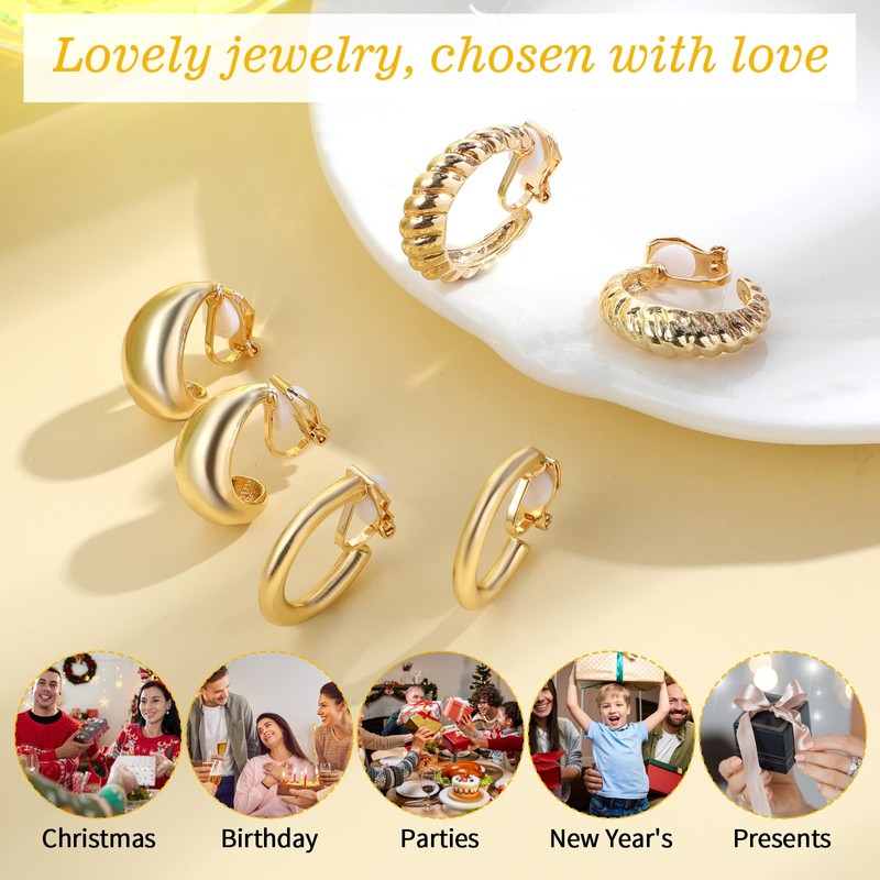 - Versatile Clip-On Earrings: These three pairs of gold earrings clip on are cute and well-designed to match any outfit. The three earrings come in different styles: a twisted croissant, a teardrop, and a hollow tube. These gold and silver clip-on earrings look like real earrings that you would wear with your ears pierced