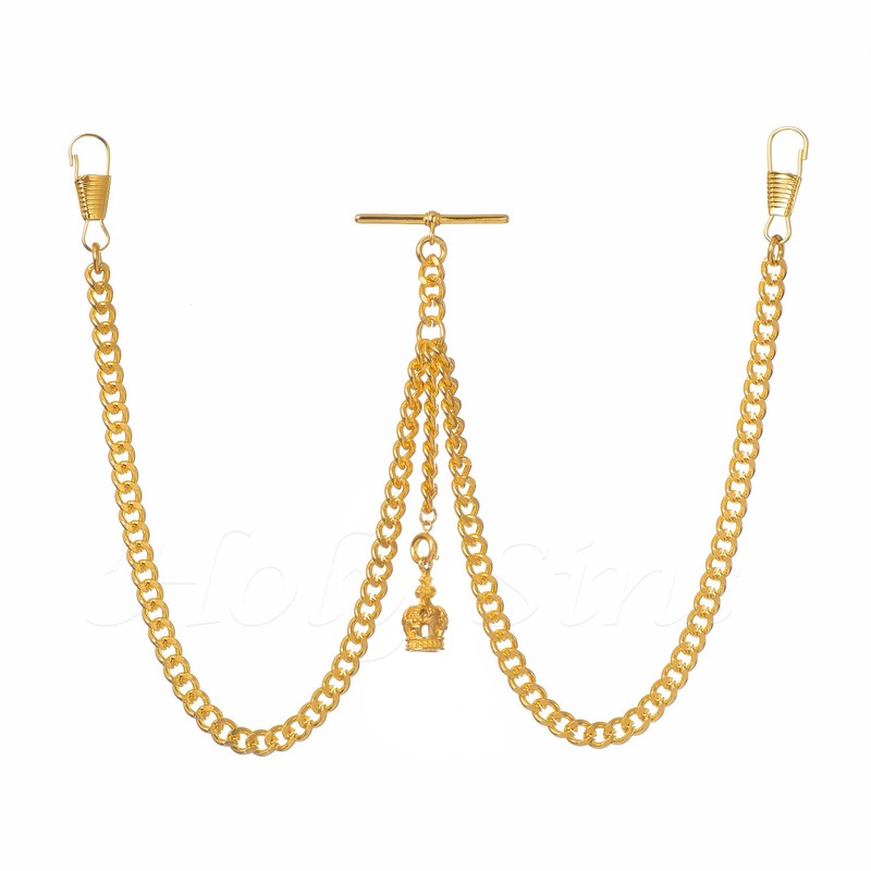 Gold Colour Double Albert Pocket Watch Chain With Crown Pendant 009-G (14")