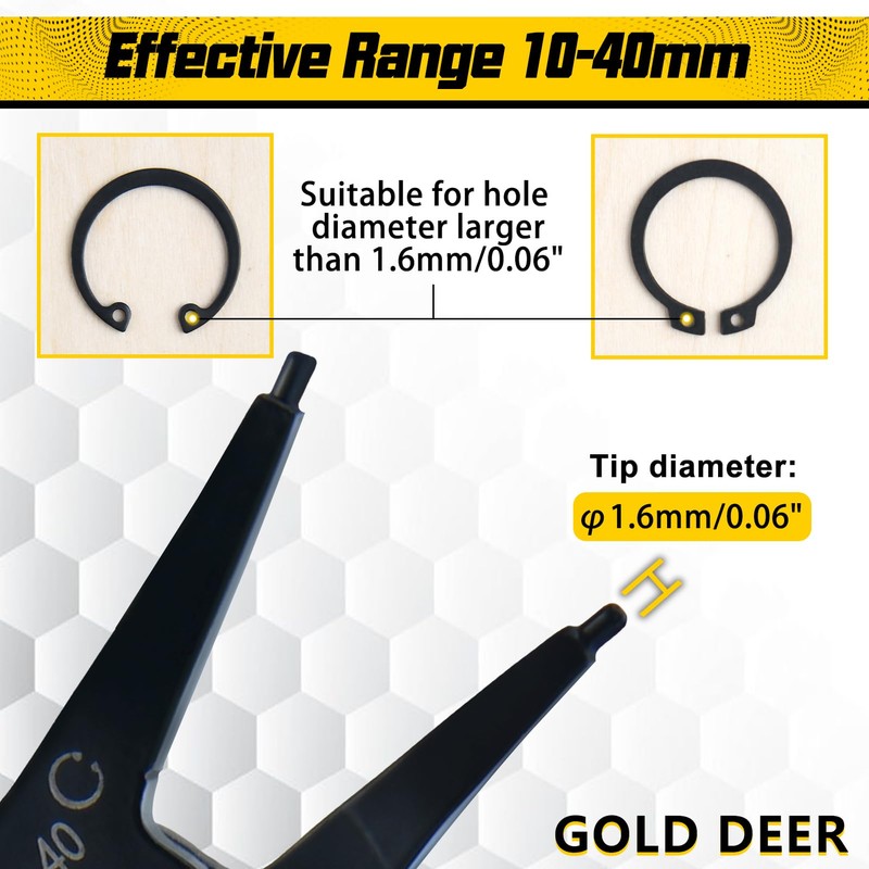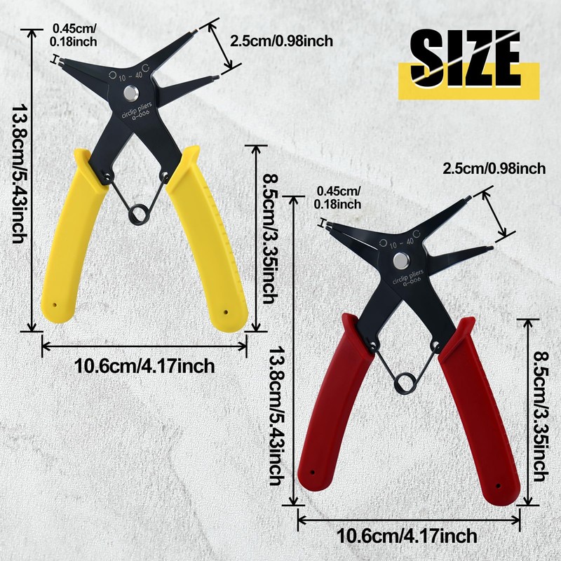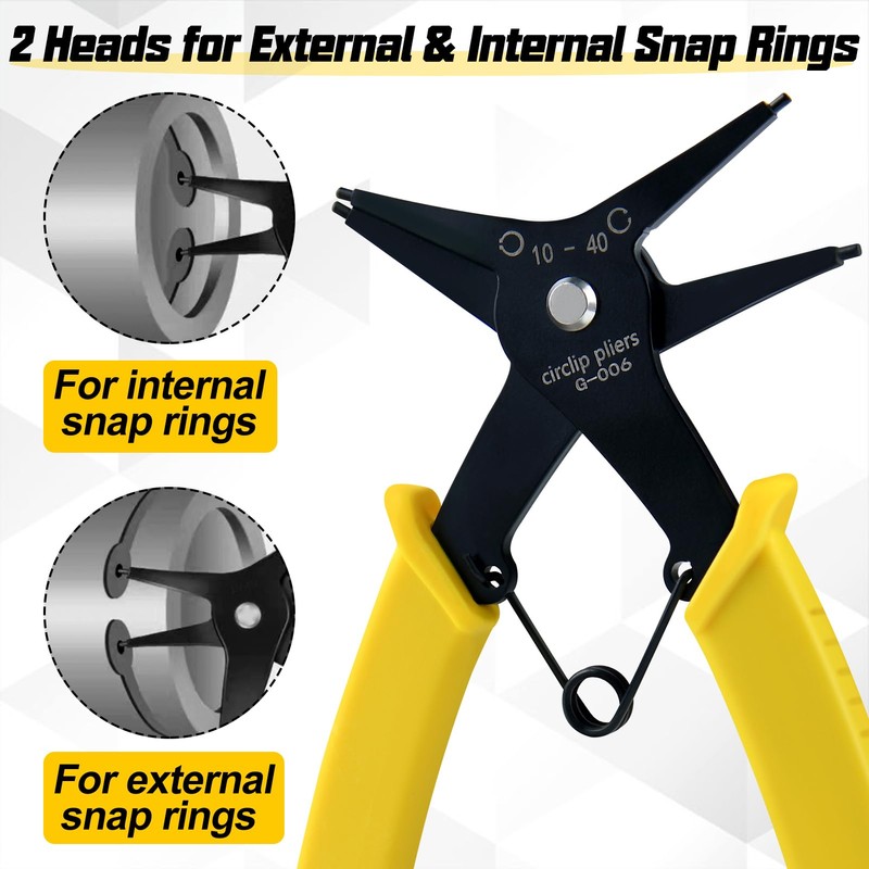 - Design: The two-in-one design of the pliers' heads allows for the installation and removal of both the inner and outer circlips without the need to change heads; the pliers are small and lightweight, making them easy to carry and store.