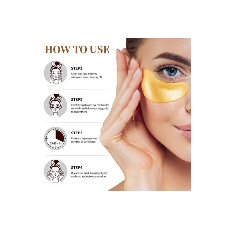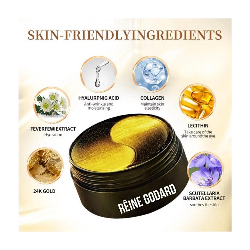 - Hydro Gel Eye Patches with Hyaluronic Acid, Collagen, 24K Gold, and Herbal Extracts: A sophisticated eye treatment designed to refresh and protect the delicate eye area. These patches deliver a potent blend of hydrating hyaluronic acid and collagen to help maintain elasticity and smooth the skin around the eyes. The 24K gold provides a luxurious touch while supporting a radiant, luminous look. Herbal extracts work to soothe and calm the eye area, assisting in reducing puffiness and dark circles. The formula aims to moisturize deeply, combat the appearance of wrinkles, and hydrate for a visibly refreshed, revitalized eye contour. Use regularly to support a more rested, youthful-looking eye area. ingredients: Water/Aqua/Eau, Glycerin, Carrageenan, Butylene Glycol, Ceratonia Siliqua (Carob) Gum, Colloidal Gold, Sodium Hyaluronate, Hydrolyzed Collagen, Caffeine, Niacinamide, Aloe Barbadensis Leaf Juice Powder, Tocopheryl Acetate, Allantoin, Jania Rubens Extract, Adenosine, Lavandula Angustifolia (Lavender) Oil, Ricinus Communis (Castor) Seed Oil, Calcium Lactate, Xanthan Gum, Disodium Edta, Peg-60 Hydrogenated Castor Oil, Synthetic Fluorphlogopite, Mica, Tin Oxide, Chlorphenesin, Phenoxyethanol, Gold (Ci 77480), Iron Oxides (Ci 77491), Titanium Dioxide (Ci 77891)