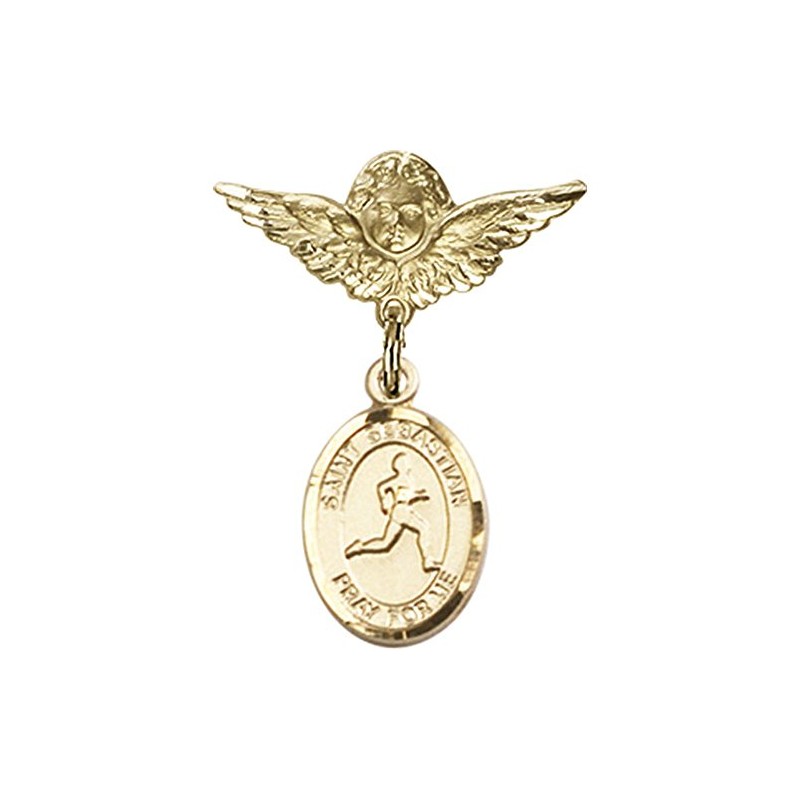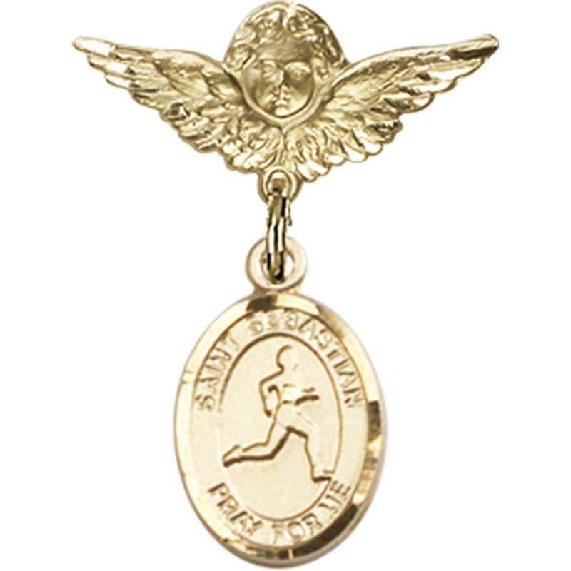 14kt Yellow Gold Filled Baby Badge with St. Sebastian/Track & Field Charm and Angel w/Wings Badge Pin