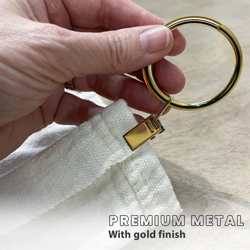 - This set of 20 Gold finish drapery rings offers a sleek and streamlined design to enhance the look of window curtains in your living space. The glossy gold finish adds a modern touch while providing extra length and neat pleats to your drapes, ensuring a polished and sophisticated appearance.