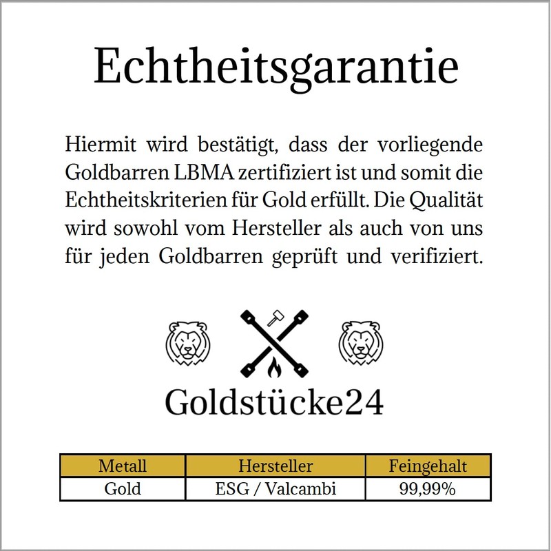 The authenticity of the gold bar is guaranteed in writing. The box contents include a guarantee of authenticity from Goldstücke24.