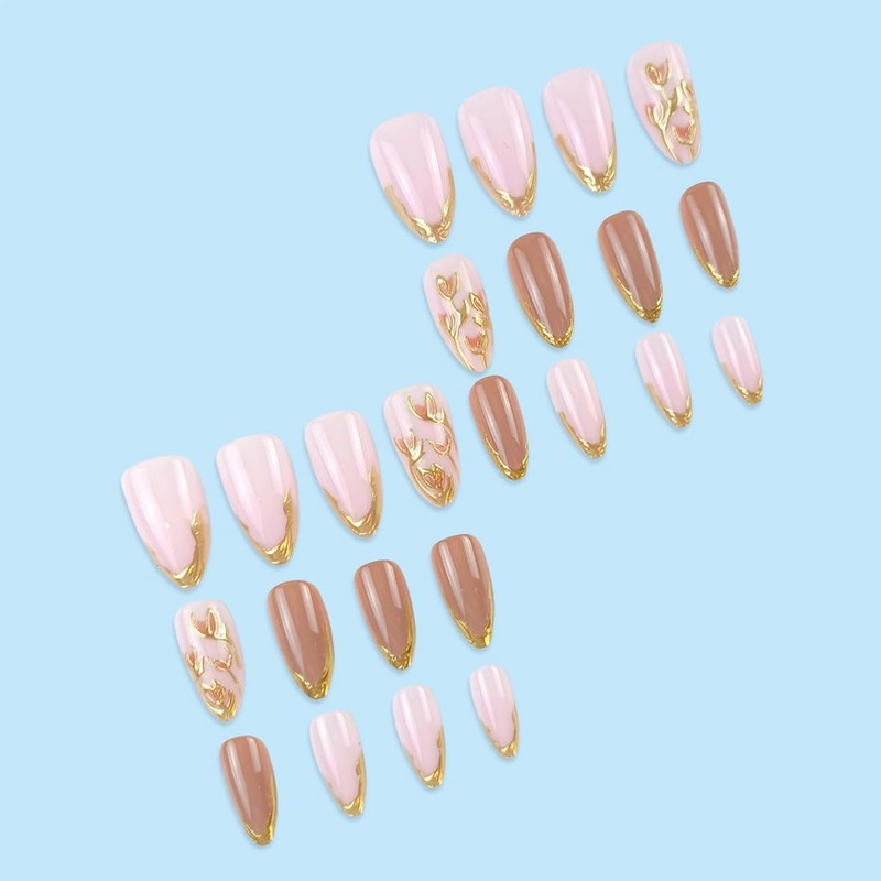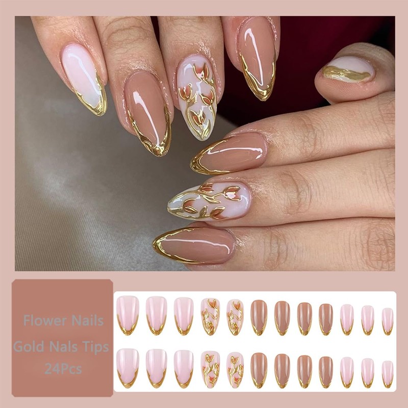- 3D Gold Nails Set: Our almond shaped press on nails designs is exquisite and beautiful. It contains 24 pcs medium almond fake nails and a set of DIY nail art tools. There are 12 different sizes of french tip fake nails. You can choose the most suitable acrylic false nails for yourself.