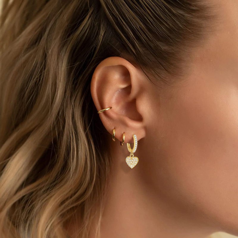 Gold Huggie Earrings with Charm Small Hoop Earrings Shiny Zircons 18K Gold Pl...